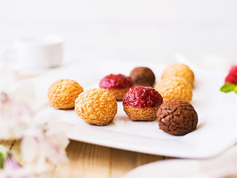 По 2 штуки: шу с шоколадным кремом, шу с малиной, шу с сырно-морковным кремом, шу с абрикосовым кремом.