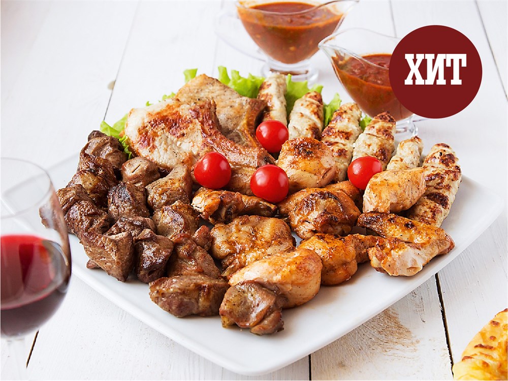 2 шашлыка из свинины - 330 г, 2 шашлыка из курицы - 490 г, 2 стейка из свинины - 390 г, 2 порции люля-кебаб из курицы - 320 г, доставляется в специально испеченном каравае.