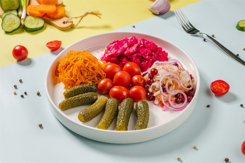 Капуста маринованная, морковь по-корейски, корнишоны, помидоры черри, лук, масло, клюква.