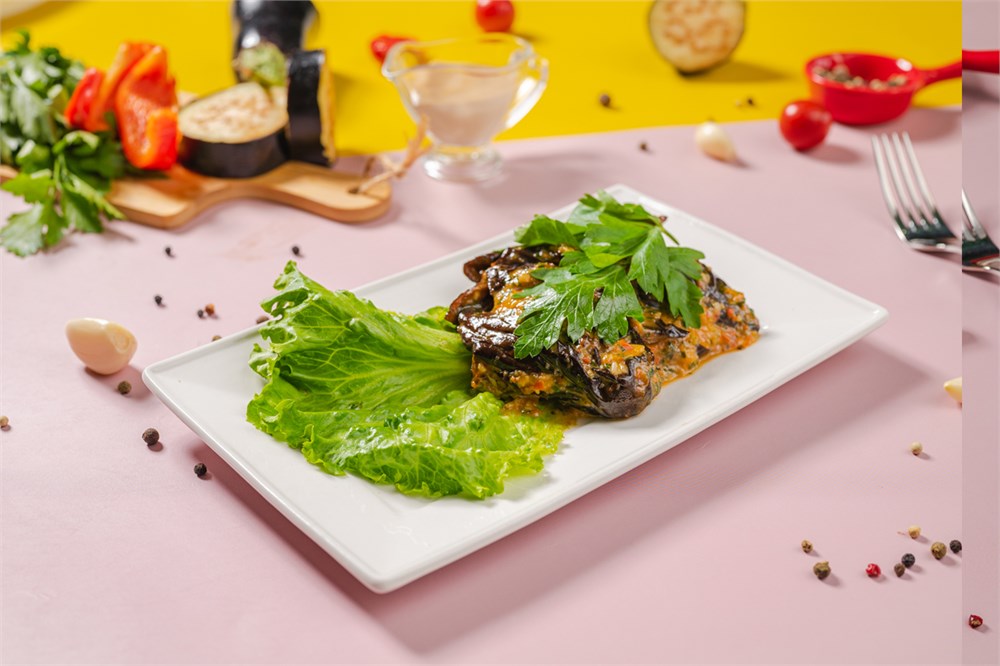 Обжаренные баклажаны с острой заправкой на основе болгарского перца, чеснока, красного перца, растительного масла и зелени.