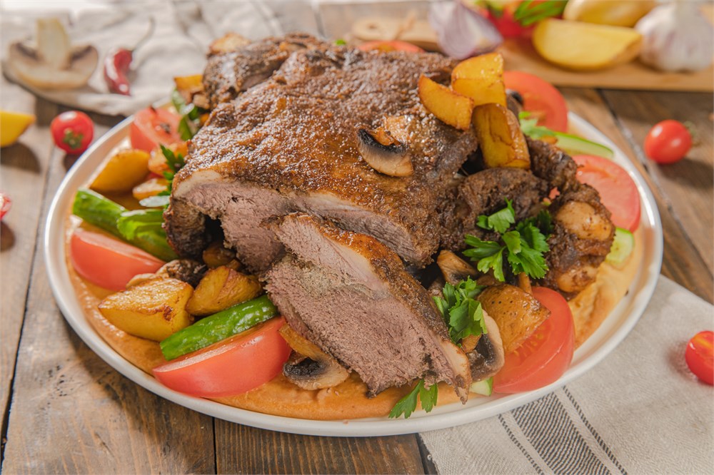 Баранья ножка, зажаренная целиком, подаётся с гарниром из картофеля и грибов на хлебной лепёшке. Блюдо отпускается по весу. Основное блюдо - 1000 г, гарнир - 1029 г. Итоговый вес 2,5-3,5 кг. Цена указана за 1 кг.