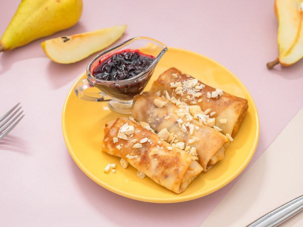 Украшается кешью. Доставляется с вареньем из чёрной смородины.