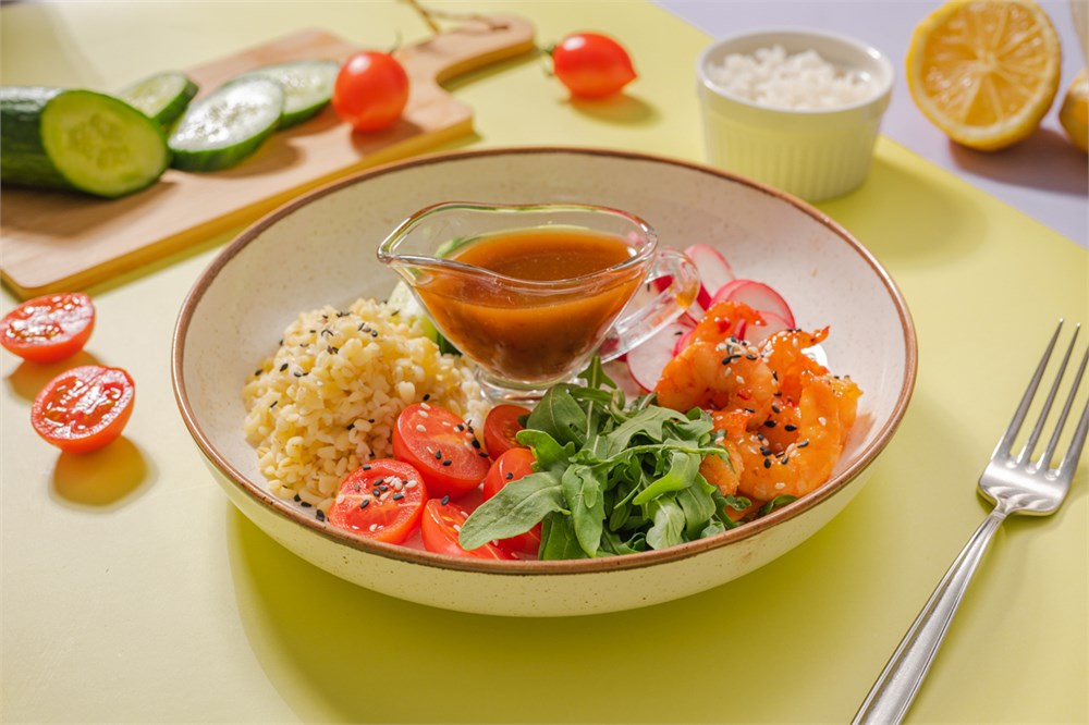 Булугур, тигровые креветки, черри, огурец, редис, руккола, чесночная паста, соус сладкий чили, семена кунжута, японский соус.