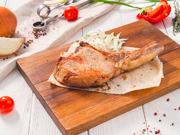 Чалагач из свинины - 240 г, лук - 30 г, соус сацебели - 30 г, лаваш - 10 г.