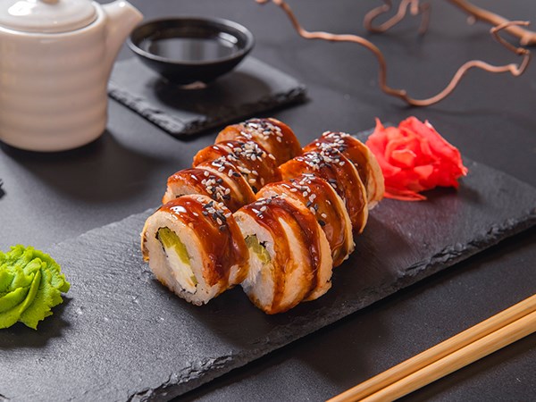 Рис, сыр креметте, нори, такуан, угорь, соус унаги, семена кунжута.