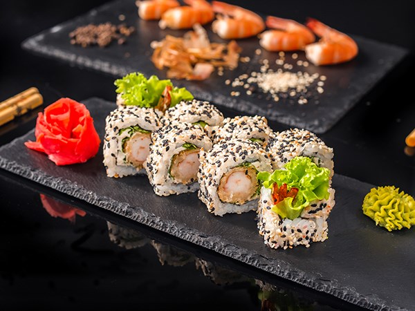 Рис, сыр креметте со сладким чили, креветки, сухари панко, кляр, кунжут, лист салата, нори.