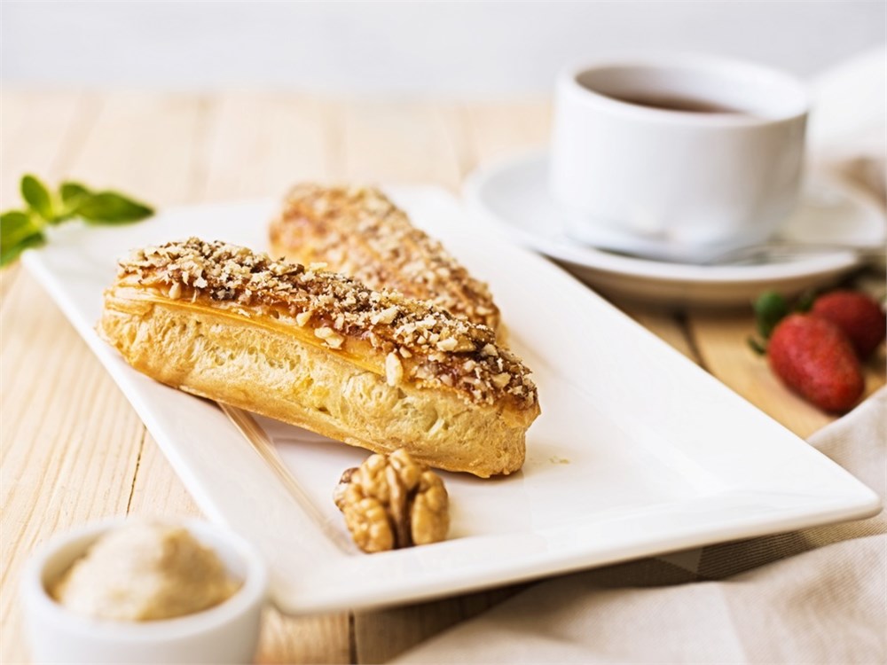 Заварное тесто, крем с грецким орехом, глазурь из соленой карамели, грецкий орех молотый.