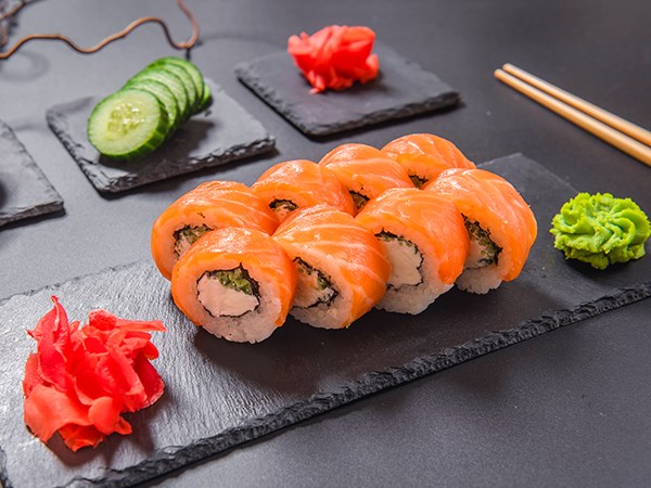 Лосось, рис, нори, сыр творожный, огурец.