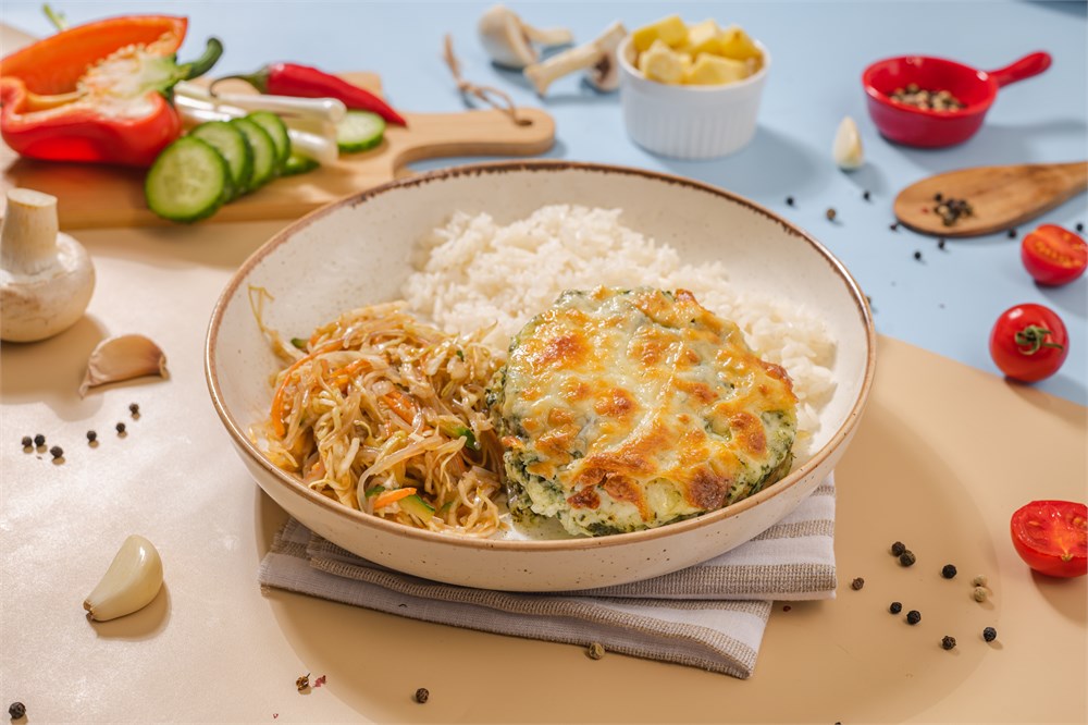 Филе белой рыбы с шампиньонами, шпинатом, луком, соусом Бешамель и сыром моцарелла. Доставляется с гарниром из риса и лёгким салатом из капусты, огурца, моркови и фунчозы.