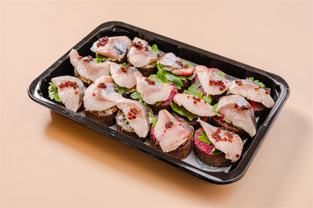 Канапе с ароматным маслом (зелень и чеснок) и сельдью - 8 шт.; канапе со свекольным муссом и сельдью - 7 шт.