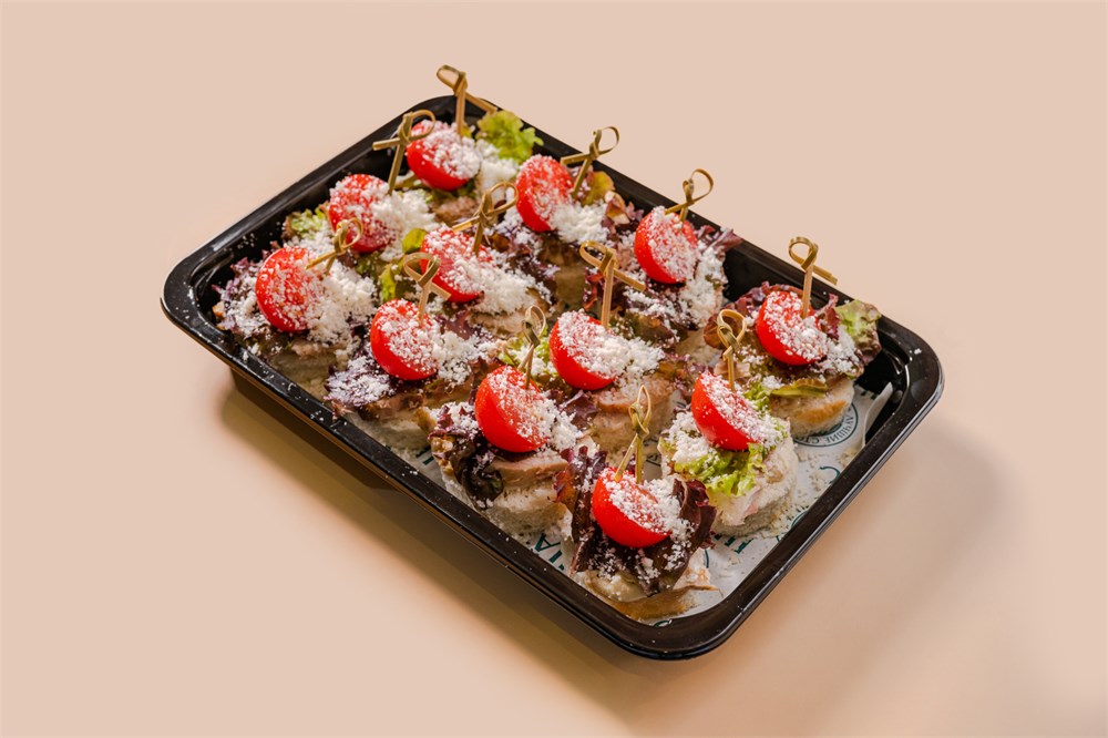 Канапе "Цезарь": соус Цезарь, копчёная курочка, салатный микс, черри, пармезан - 12 шт.