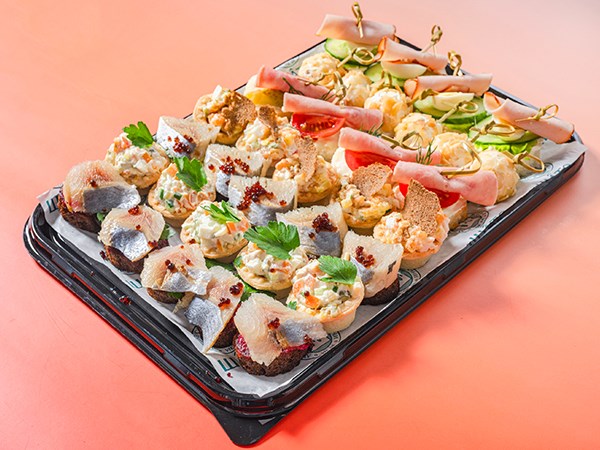 Канапе с карбонадом и перепелиным яйцом - 4 шт.; канапе с ветчиной, черри и корнишонами - 4 шт.; канапе с ароматным маслом и сельдью - 5 шт.; сырный шарик с виноградом - 6 шт.; тарталетка с салатом с семгой - 5 шт.; канапе со свекольным муссом и сельдью - 5 шт.; тарталетка с оливьей с копченой курицей - 5 шт.