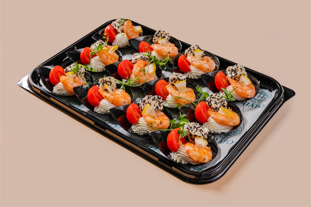 Креманки с тигровой креветкой, сливочным соусом, черри, брынзой в кунжуте, лимоном и зеленью - 12 шт.