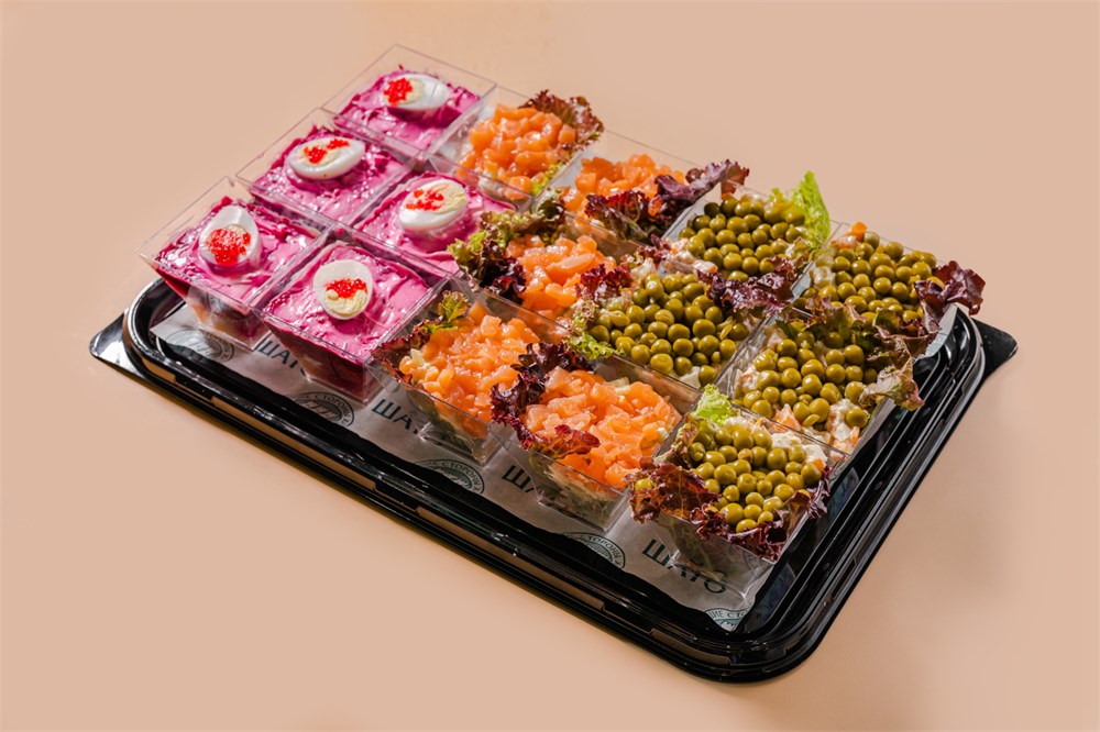 Салат Оливье с сёмгой - 5 шт., сельд под шубой - 5 шт., с говядиной и овощами - 5 шт.