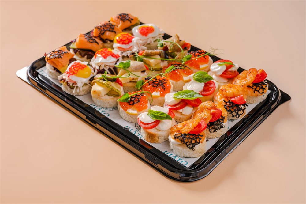 Премиум-набор канапе: канапе с тигровой креветкой, сливочным соусом, черри и кружевными чипсами - 4 шт., канапе с моцареллой, соусом песто и базиликом - 4 шт., канапе с красной икрой, сливочным маслом, лимоном и кружевными чипсами - 4 шт., канапе с соусом из печёного перца, адыгейским сыром, баклажаном, кабачком и болгарским перцем и микрозеленью - 4 шт., канапе с крабовыми палочками и перепелинным яйцом, сливочным соусом, миксом салата и кружевными чипсами - 4 шт., канапе с сёмгой и авокадо, сливочным соусом, миксом салата и кружевными чипсами - 4 шт.