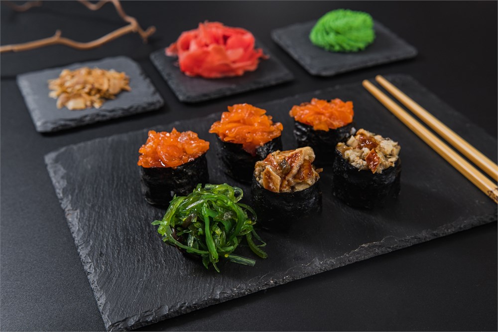 Гунканы с сёмгой: рис, сёмга, сладкий чили, нори. Гунканы с угрём: рис, угорь, соус терияки,нори. Салат с водорослями чука.