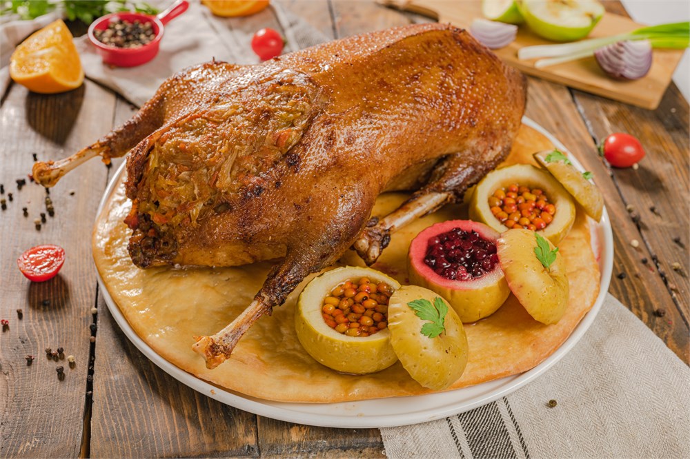 Гусь, фаршированный тушёной капустой с запечёнными яблоками на лепёшке. Итоговый вес 2,5-3,5 кг. Цена указана за 1 кг.
