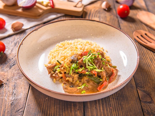 Индейка, болгарский перец, репчатый лук, стручковая фасоль, сливки, устричный соус. Доставляется с гарниром из булгура.