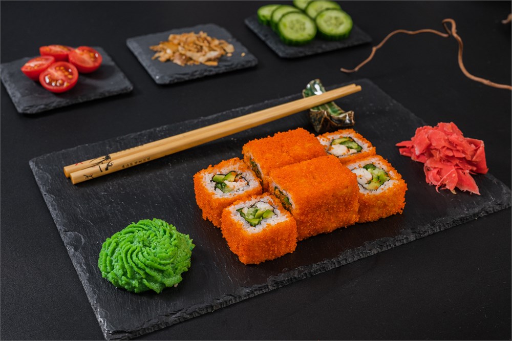 Креветки тигровые, рис, нори, авокадо, огурец, икра тобико.