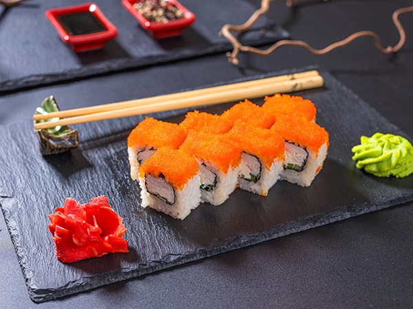 Рис, сыр креметте, крабовые палочки, огурец, икра тобико, нори.