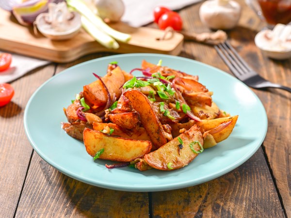 Картофель, репчатый лук, грибы, перья зеленого лука.