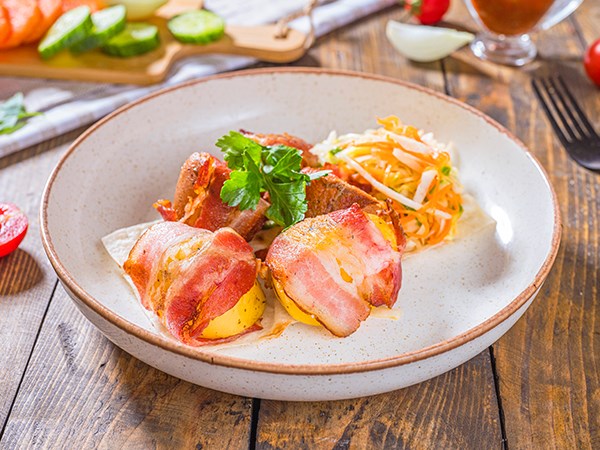 Доставляется с лавашом и салатом из белокочанной капусты, огурца и моркови.