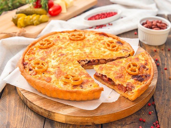 Охотничьи колбаски, картофель во фритюре, отварная красная фасоль, корнишоны, томаты, моцарелла, репчатый лук, соус барбекю, яично-молочная заливка.