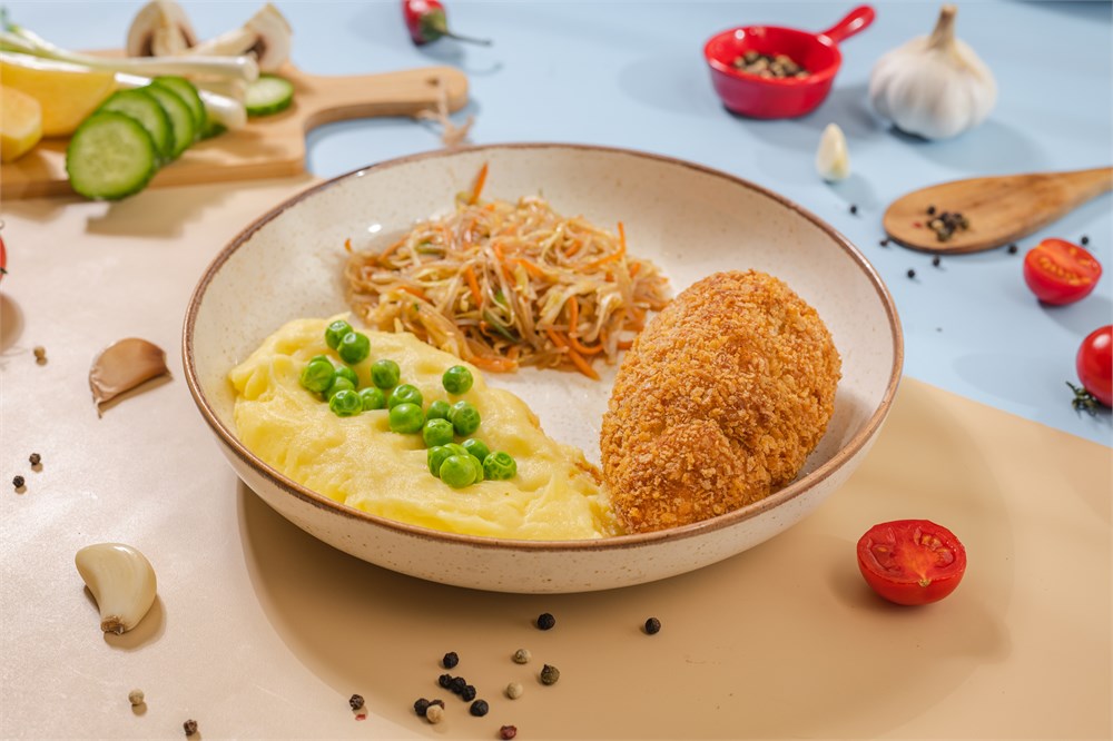 Доставляется с гарниром из картофельного пюре, зелёного горошка и лёгкого салата из капусты, огурца, моркови и фунчозы.