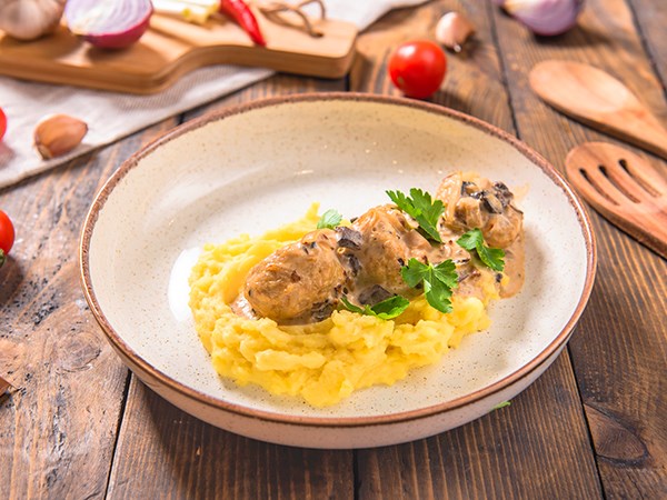 Куриные тефтели в сливочно-грибном соусе с картофельным пюре Доставка (бизнес-ланч)