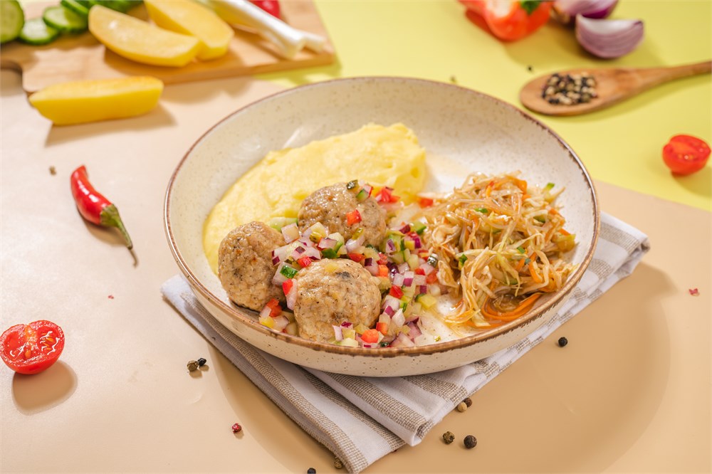 Митболы из куриного фарша. Конкассе из томатов, свежего огурца, корнишонов, перца болгарского и лука. Доставляется с гарниром из картофельного пюре и лёгким салатом из капусты, огурца, моркови и фунчозы.