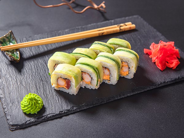 Креветки тигровые, огурец, помидоры, сыр креметте, нори, рис, икра тобико, соус кимчи.