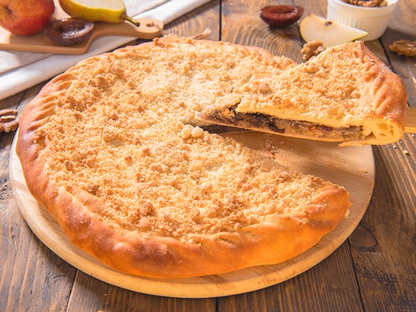 Груша, банан, чернослив, грецкий орех, сливочный соус с сыром креметте, штрейзель.