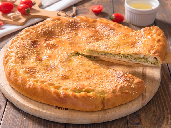 Курица, шпинат, сыр сулугуни, чеснок, репчатый лук, сливки, майонезный соус, семена кунжута.