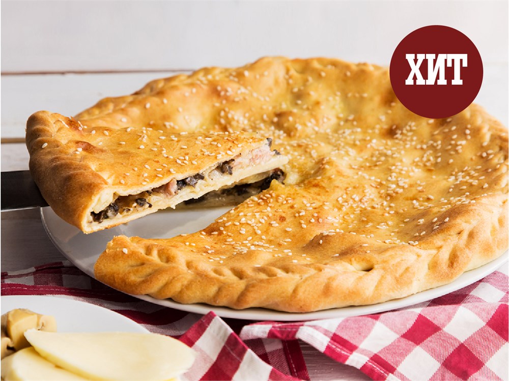 Начинка: свинина и говядина кручёные, грибы, лук жареный, сыр сулугуни.