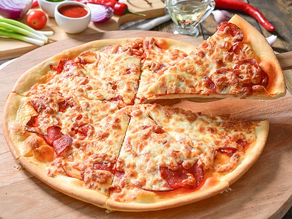 Копчёная куриная грудка, пепперони, ветчина, колбаса копчёная, сыр моцарелла, томаты.
