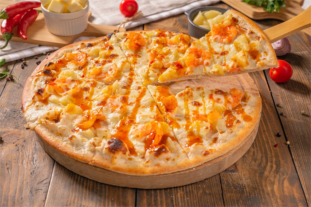 Соус сливочный, креветки тигровые, ананасы, сыр моцарелла, соус манго-чили.