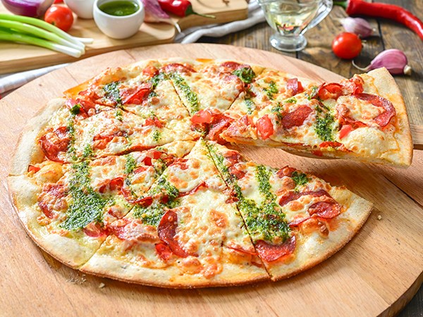 Пепперони, томаты, маринованный перец, сыр моцарелла, соус песто, соус бешамель.