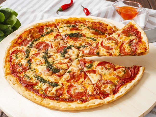 Сырокопчёная колбаса, сыр моцарелла, соус песто, соус томатный с французскими травами.