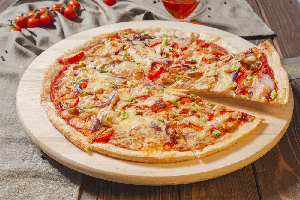 Курица копченая, перец болгарский, сыр моцарелла, соус томатный, соус терияки, лук зеленый, лук порей.