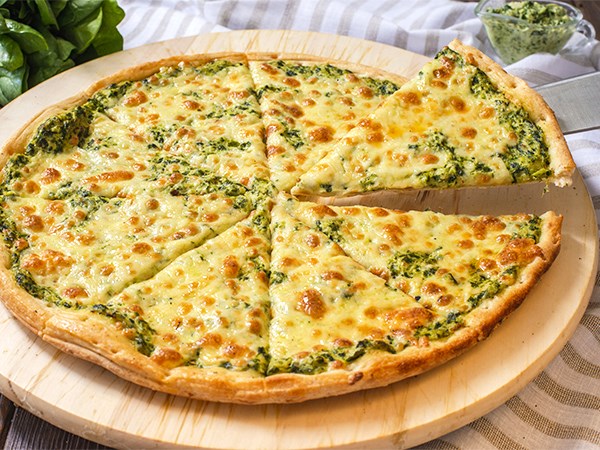 Курица, разобранная на волокна, сыр моцарелла, соус шпинатный.