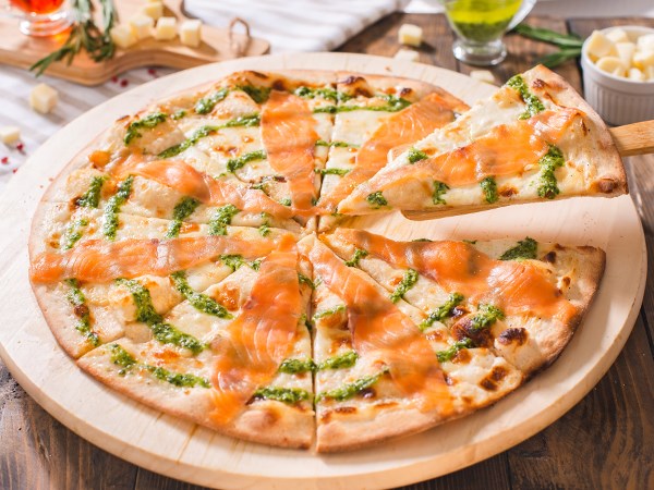 Филе сёмги слабо-солёное, сыр креметте, сыр моцарелла, сливки, соус песто, зелень.