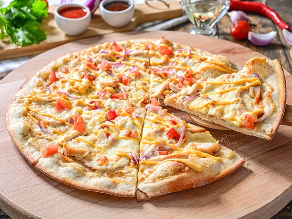 Копчёная куриная грудка, томаты, красный репчатый лук, сыр моцарелла, сырный соус, соус ранч.