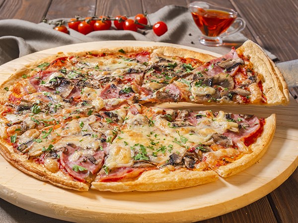 Ветчина, шампиньоны, сыр моцарелла, соус томатный.