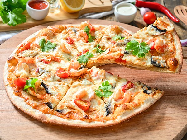 Кальмары, паста том ям, тигровые креветки, шампиньоны, томаты черри, сыр моцарелла, кинза, соус бешамель.