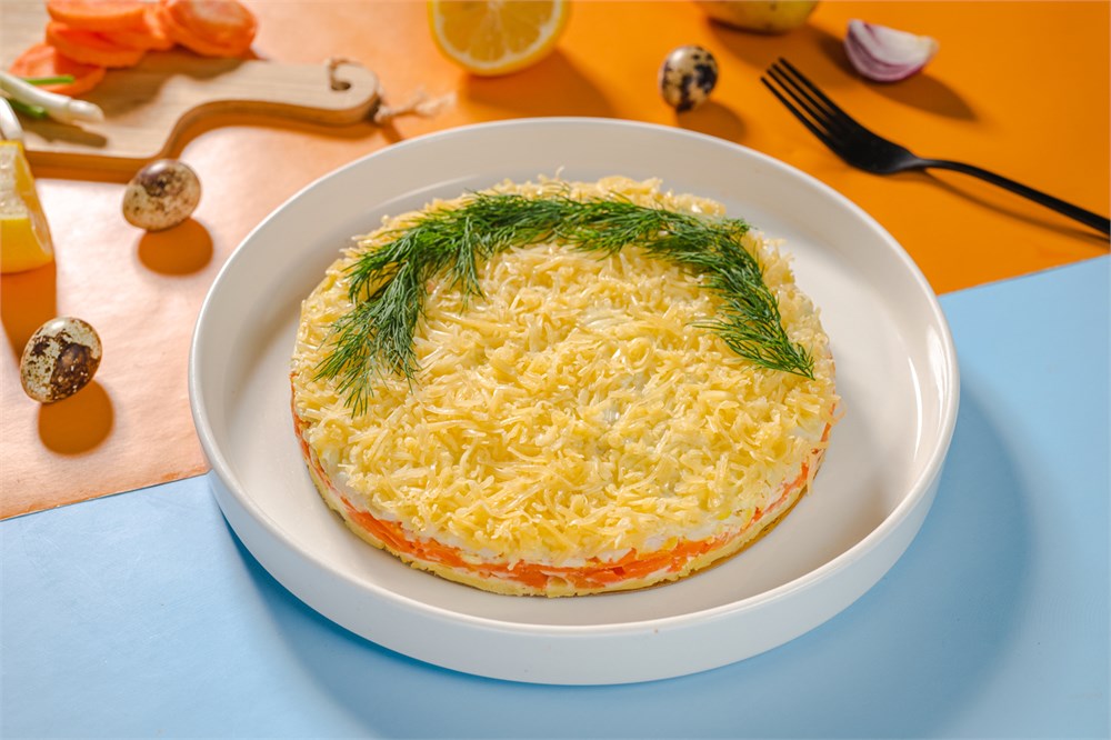 Слабосолёная сёмга, репчатый лук, морковь, отварное куриное яйцо, картофель, голландский сыр, майонезный соус. Заказ оформляется за 24 часа!