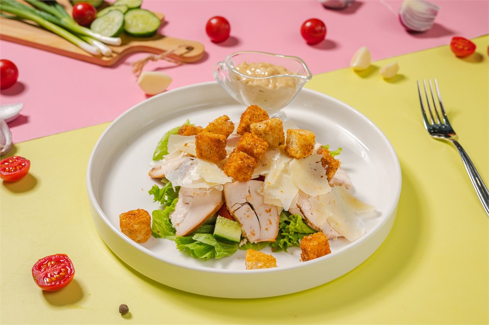 Куриное филе, огурцы, помидоры, сыр пармезан, лист салата, гренки, заправка "Цезарь".