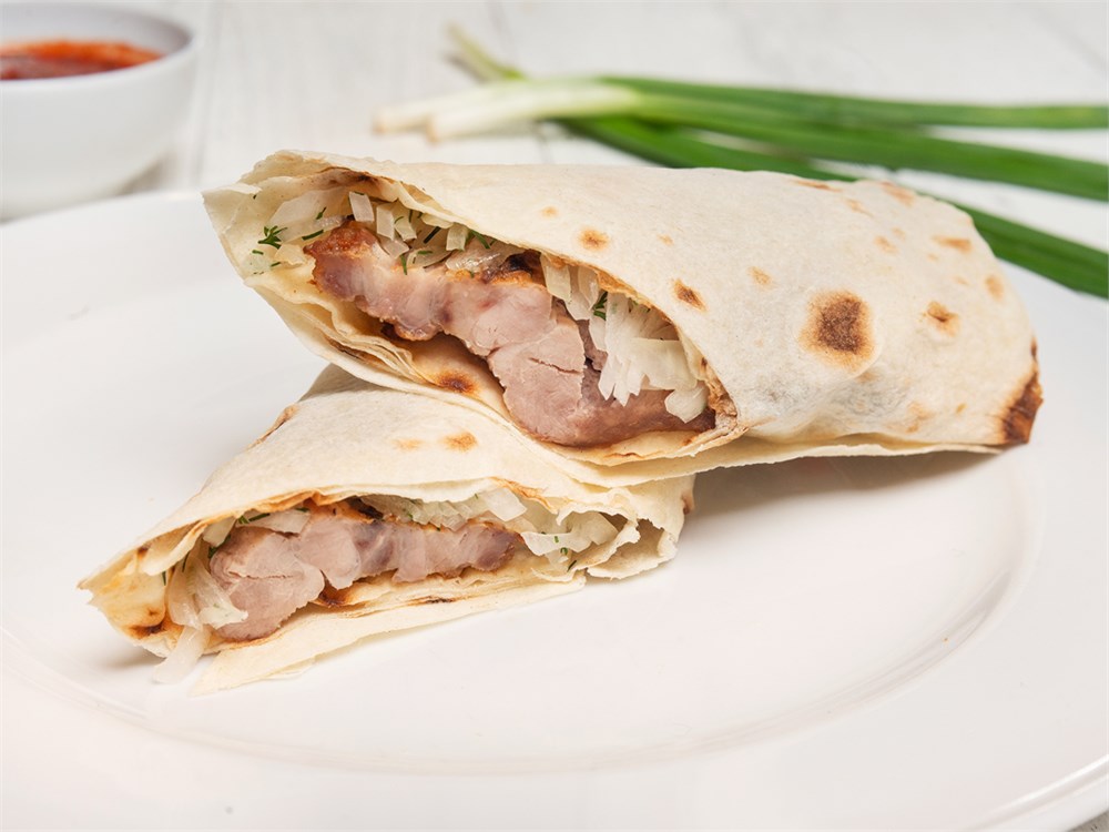 Шашлык из свинины с луком, завернутый в тонкий лаваш с соусом сацебели.