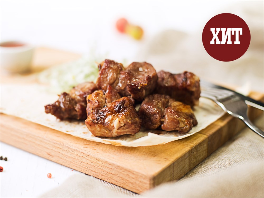 Шашлык из свинины - 180 г, лук - 30 г, соус сацебели - 30 г, лаваш - 10 г.