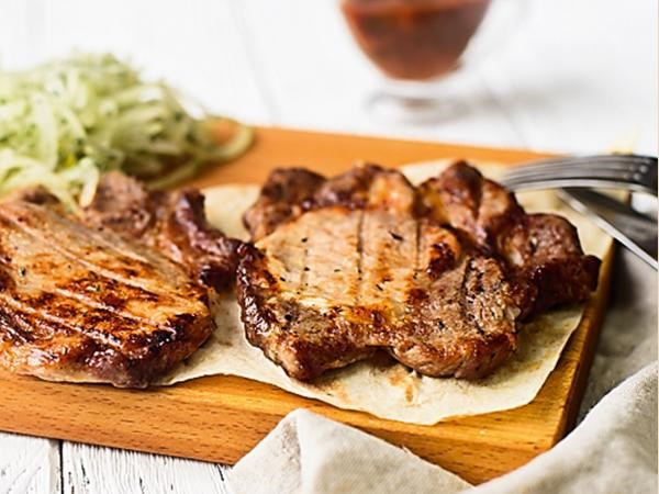 Корейка из свинины - 230г, лук - 30 г, соус сацебели - 30 г, лаваш - 10 г.