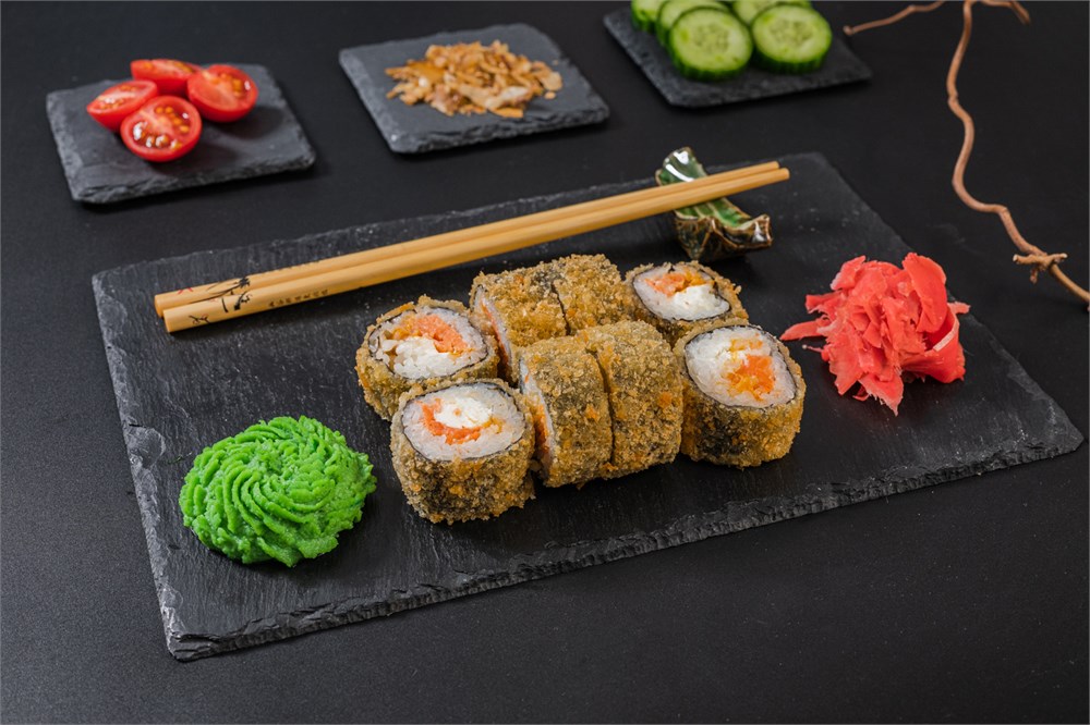 Лосось, рис, нори, сыр творожный, острый соус Кимчи, сухари панко.